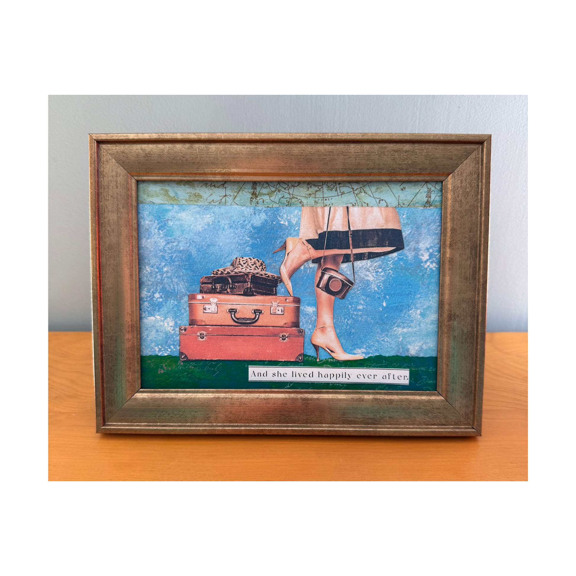 "And she lived happily ever after" original flat collage features a vintage-inspired photo of a lady leaning against suitcases, set in a scene created from hand-painted papers.