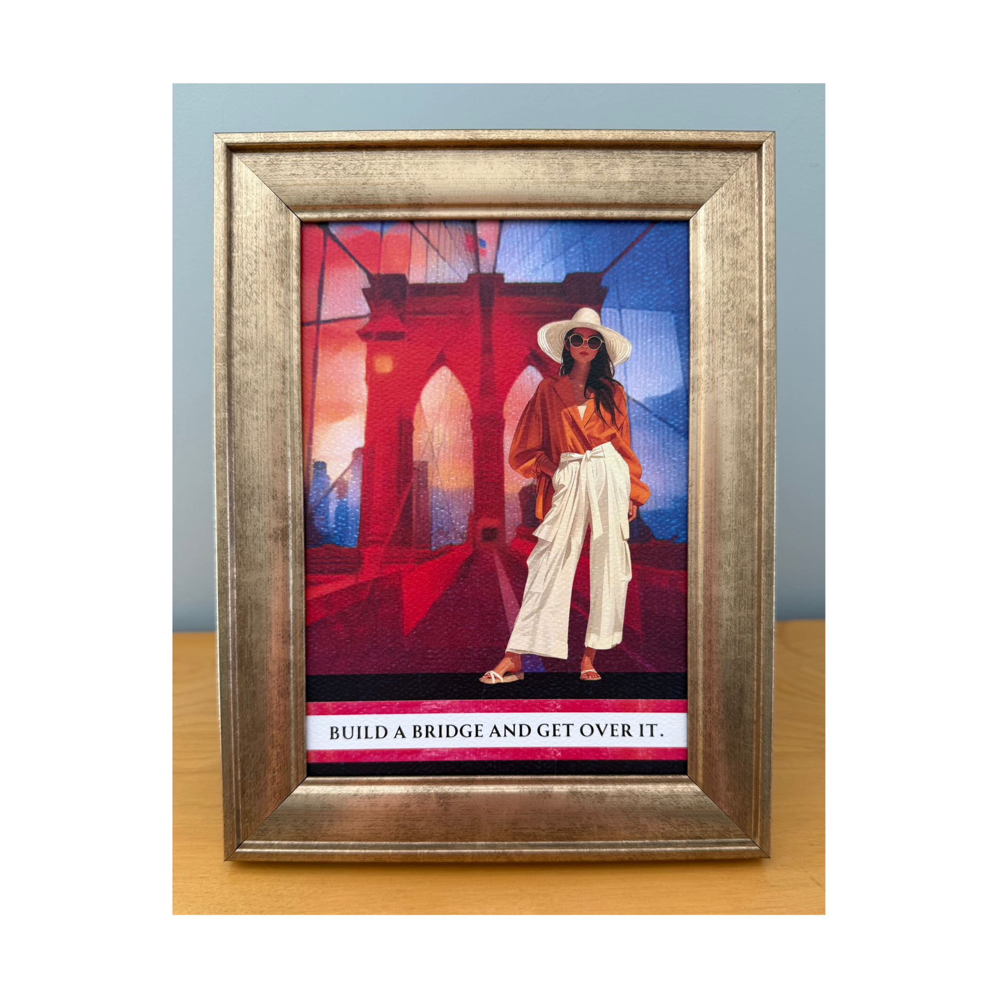 This "Build a bridge and get over it" features an abstract-filtered Brooklyn Bridge with a modern lady standing on the bridge over the saying. This art print would be perfect for any New York City/Brooklyn lover in your life, or anyone who likes just a bit of sass.