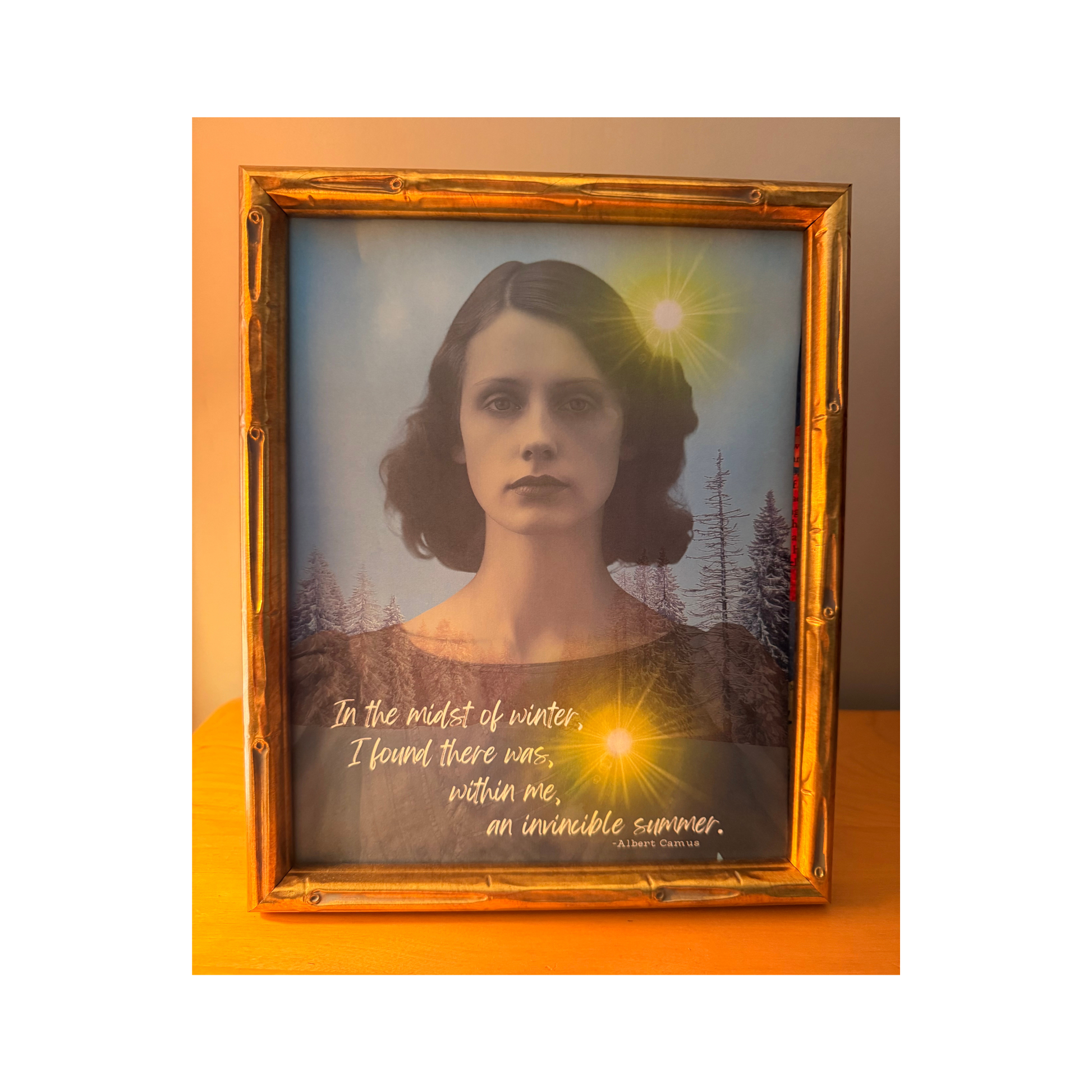 This art print features a vintage lady in sepia tones, transposed vapor-like against a winter snow scene, with a bright sun emanating from her heart and from beside her head. The Albert Camus quote "In the midst of winter, I found there was, within me, an invincible summer."